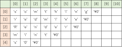 string型が文字配列+\0'と同じだと思うと、配列が配列になっている構造です。