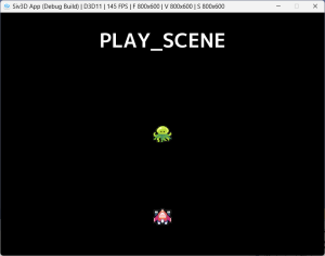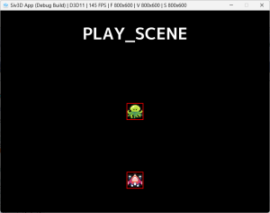 void InitPlayer(gameChar& _player) { 省略 //_player.rect = { ごにょごにょ}; SetCharaRect(_player, SizeF{ PLAYER_RECT_SIZE, PLAYER_RECT_SIZE}); _player.moveDir = { 0, 0 }; _player.isAlive = true; } void InitEnemy(gameChar& _enemy) { 省略 //_enemy.rect = { ごにょごにょ}; SetCharaRect(_enemy, SizeF{ ENEMY_RECT_SIZE, ENEMY_RECT_SIZE }); _enemy.moveDir = { 1, 0 }; _enemy.isAlive = true; } void DrawPlay(gameData& _dat) { Scene::SetBackground(Palette::Black); Vec2 strMargin{ 0, Scene::Height() / 2 - FontAsset(U"font").height() }; FontAsset(U"font")(U"PLAY_SCENE").drawAt(Scene::Center() - strMargin); DrawPlayer(_dat.Player); DrawEnemy(_dat.Enemy); //_dat.Player.tex.resized(PLAYER_CHR_SIZE).drawAt(_dat.Player.pos); //_dat.Enemy.tex.resized(ENEMY_CHR_SIZE).drawAt(_dat.Enemy.pos); }