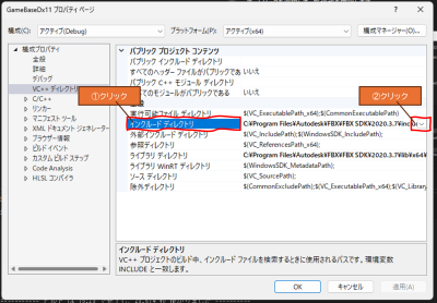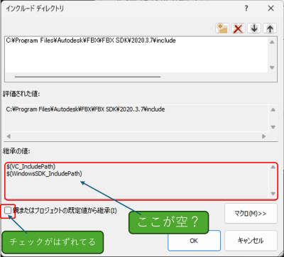 を確認、確認できたら、改めて、FBXSDKのディレクトリを設定してみる。