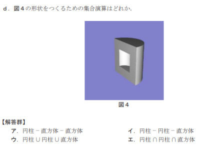 図4のような立体形状を作るために、「円柱」と「直方体」の組み合わせでどのような集合演算を行えばよいか?を問う問題です。