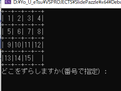 void PrintBoard(Board& _board) { string ruledLine = "+--+--+--+--+"; cout << ruledLine << endl; //飾り枠の表示 for (int j = 0; j < BOARD_HEIGHT; j++) { for (int i = 0; i < BOARD_WIDTH; i++) { if (空白の位置じゃなかったら) 2文字幅でそのボード枠の中の数字を表示 例 |13 else 空白なので2文字幅でスペースを表す文字を表示 |** ←スペースでもいいよ } cout << "|" << endl; 飾り枠をつけて改行 cout << ruledLine << endl; 最後の行の飾り枠 } }