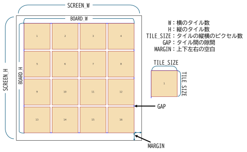 const int W = 4; const int H = 4; const int TILE_SIZE = 80; // タイルの一辺のサイズ(px) const int GAP = 6; // タイル間の隙間(px) const int MARGIN = 24; // 外枠と盤面の余白(px) /* 盤面・画面のサイズ計算(const 式) */ //BOARD_W、BOARD_Hは余白を除いた盤面の大きさ const int BOARD_W = W * TILE_SIZE + (隙間の数(横)) * 隙間の幅; const int BOARD_H = H * TILE_SIZE + (隙間の数(縦)) * 隙間の幅; const int SCREEN_W = BOARD_W + 左右のマージン(余白); const int SCREEN_H = BOARD_H + 上下のマージン(余白);