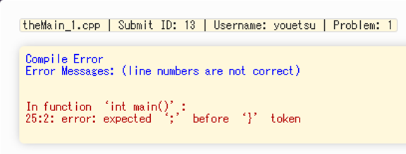 compilationerror.png Share via Share via... Twitter LinkedIn Facebook Pinterest Telegram WhatsApp Yammer Reddit Teams最近の変更Send via e-Mail印刷パーマリンク × Size of this preview: 576 × 219 pixels. Other resolutions: 57 × 21 pixels 144 × 54 pixels 288 × 109 pixels 432 × 164 pixels 576 × 219 pixels online-judge:usage:compilationerror.png ( 576 × 219 pixels ) Information 日付:2021/08/18 22:49ファイル名:compilationerror.pngフォーマット:PNGサイズ:35KB幅:576高さ:219 参照先 All Submissions(すべての提出物) 閲覧権限の無いページや非表示ページは表示されないので、このリストは完全でない場合があります。 Metadata Exif IPTC game-engineer/classes/2021/online-judge/usage/all-submissions.txt 最終更新: 4年前by root
